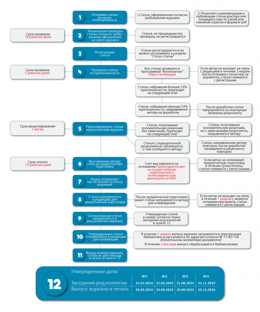 Оригинальность текста статьи должна составлять не менее 53%, не допускается применение специальных программ или макросов, скрывающих заимствованный текст при проверке на плагиат, путем добавления скрытых символов, множественных пробелов между словами, перестановки слов, замены букв русского алфавита на английский.